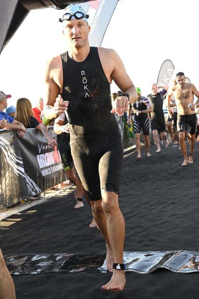 AG45-49 (ja, jeg bliver sgu ikke yngre), skulle starte i sidste wave (10), hvorfor jeg på forhånd var klar over, at det ikke ville blive den hurtigste svømmetid. Der var simpelthen for mange at overhale – måske 800-1.000 folk – og specielt rundt om bøjerne, var det en udfordring ikke at blive ramt af brystsvømmer-ben og arme, men jeg undveg ok – dog sænker det bare farten betydeligt. Som svømmer har jeg altid været vandt til nogenlunde frit vand foran, men mine 2 IMWC (St. George og Nice) har tvunget mig til at opleve, hvordan det er at være i ”vaskemaskinen”. Jeg føler virkelig med de ”ikke så gode svømmere”. Anyways, kom igennem svømningen uden at bruge særligt mange kræfter, og tiden 59:32 var faktisk ret overraskende ift. hvor langsomt og let det føltes.