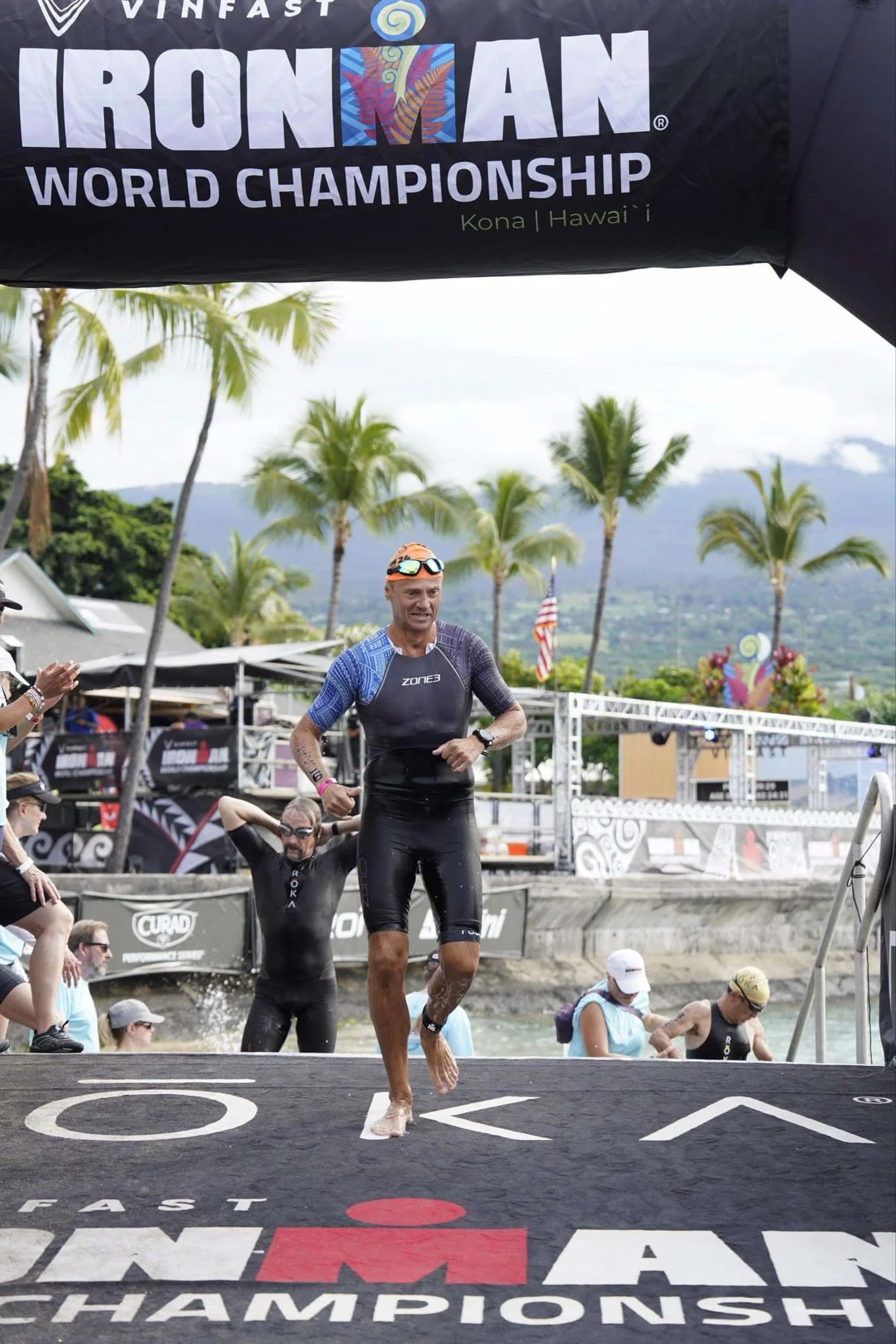 En dag, som jeg havde set frem til - og drømt om - i mange år. Som alle Ironman stævner, fik jeg sommerfugle i maven, og bad til de lokale polynesiske guder på Big Island om godt vejr, medvind på cyklen, ingen punkteringer og fart i løbeskoene. Dagen startede kl 04.00 med to kopper kaffe, og ind i transition zonen, hvor cyklen blev checket en sidste gang. Svøm: Skulle starte kl 07.30 i min aldersgruppe - en time efter pro’erne. Det var den største aldersgruppe, og det betød så også, at man ikke kunne nå at få alle ud i vandet til den officielle start. Så var ca 150 meter bagud fra start - ikke optimalt, når man i forvejen ikke er en stor svømmer. Jeg tog det god heldigvis roligt, og havde en god svøm - som dog blev meget lang Men kom op af vandet med dundrende hovedpine. Havde været i vandet i 1.5 time.