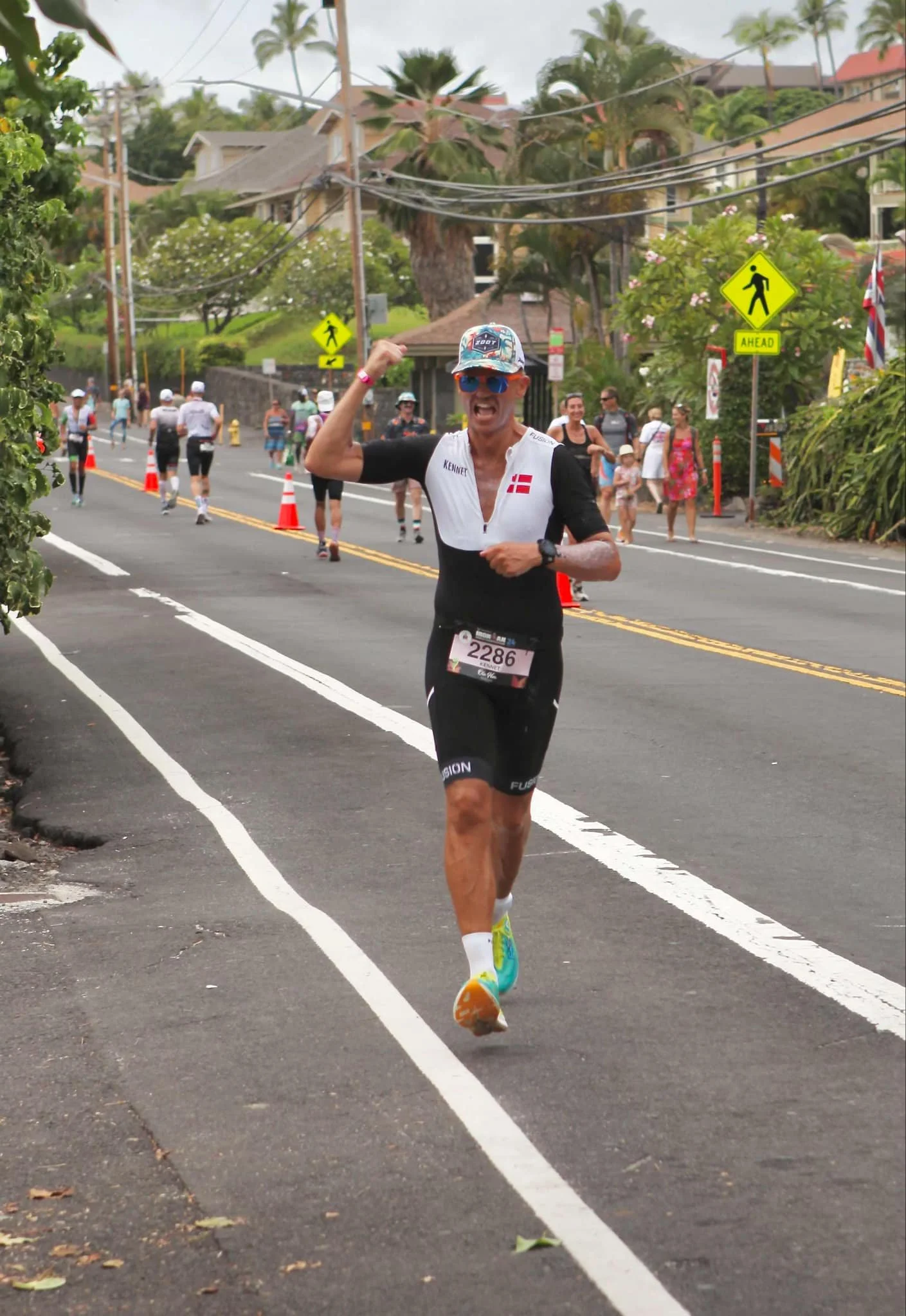 Løb: Som på cykelruten starter med med et lille loop i Kona - 10 km ud og hjem af Ali'i Drive. Mødte som den første Eva, som stod med danske flag - dejligt. Også de andre stod foran vores hus, så der var fuld hep på den første runde. Herefter blev det noget anderledes, da man skal løbe 12 km ud langs Queen Kaʻahumanu Highway, ned i hullet ved Natural Energy Lab, og så tilbage. Det blev en lidt ensom affære. Det begyndte også at blive mørkt, så skulle holde humøret oppe og blive ved med at sige, at jeg ikke skulle begynde at gå, som de mange andre jeg mødte på min vej. Men til gengæld gjorde mørket, at temperaturen blev mere og mere tålelig, selvom det forsat var varmt. Anyways, stolt af at løbe hele vejen, og det gik stærkere og stærkere de sidste 5 km. Tilbage i byen, og igennem Hoka fly zone (heppezone), hvor jeg fik et par high-fives. Ned af Palani Road, og tilbage på Ali'i Drive - og op af den røde løber. Trine og Rene fik jeg øje på med det samme - og så Eva. Måtte lige stoppe og hilse på Eva, og så de sidste 40 meter - nøj, det var fedt. Blev mødt med de velkendte ord “Kennet, you are an Ironman” - men den her betyder trods alt lidt mere i stakken.